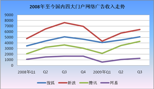 數據顯示,從2008年Q4開始,受到全球性金融危機的影響,四大門戶的網絡廣告收入都出現了下滑,而從今年Q2開始,四家網站廣告收入都開始反彈,Q3廣告收入的穩步增長更表明四大門戶網站的網絡廣告已經進一步走出低谷。