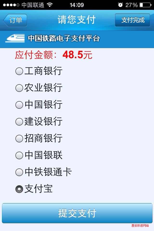 在購票付款環節,除了工行、建行等幾個銀行外,還有一個支付寶選項,用戶選擇后可以用余額、余額寶、快捷支付三種方式付款。