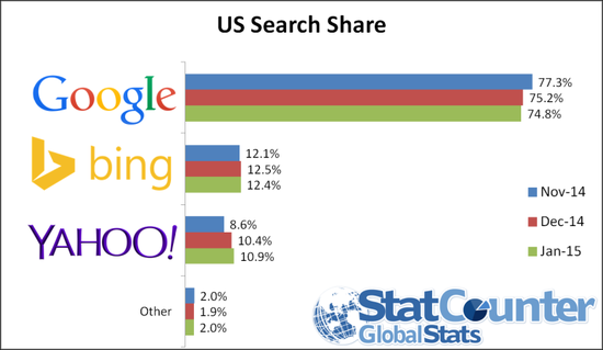 按照StatCounter的統(tǒng)計,在1月份的美國搜索市場,谷歌擁有74.8%的份額;微軟的必應排在第二,份額為12.4%;雅虎份額為10.9%。比較來看,在去年12月,谷歌、必應與雅虎的份額分別為75.2%、12.5%和10.4%。