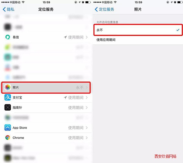 蘋果手機照片定位關閉路徑:設置→隱私→定位服務→相機→永不