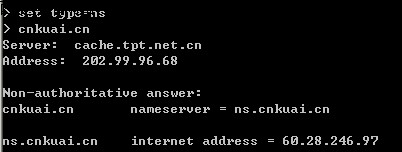 6、查詢域名ns記錄(域名所使用的DNS),輸入:set type=ns,回車,進入DNS記錄查詢模塊,然輸入您要查詢的域名,回車后,即可查詢到該域名的DNS記錄解析詳情(如下圖);