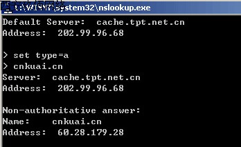 3、查詢域名A記錄,輸入:set type=a,回車,進入A記錄查詢模塊,然輸入您要查詢的域名,回車后,即可查詢到該域名的A記錄解析詳情(如下圖);
