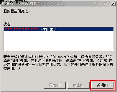 9、顯示注冊成功。(如果總是提示失敗,請檢查您的局域網是否開放了1433端口,同時檢查您的SQL鏈接超時時間,SQL默認超時時間為4秒,建議改成60秒---在SQL server 企業管理器=>工具=>選項=>高級。)