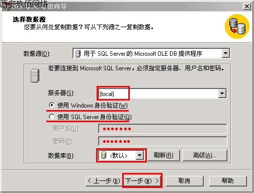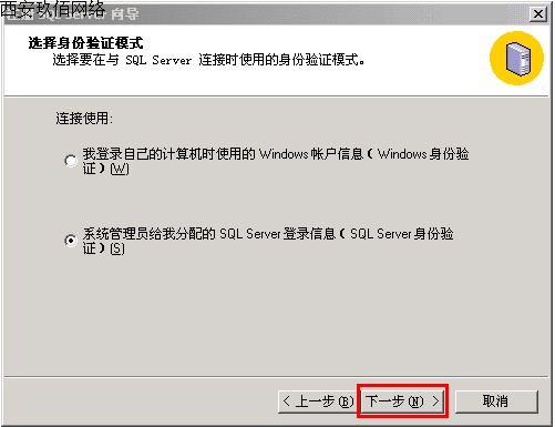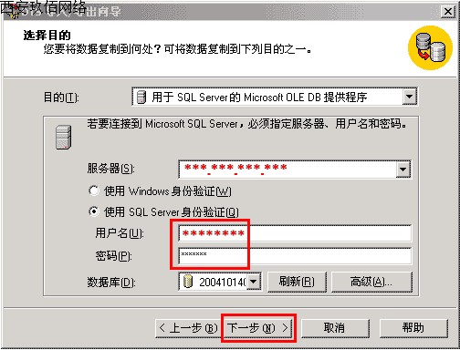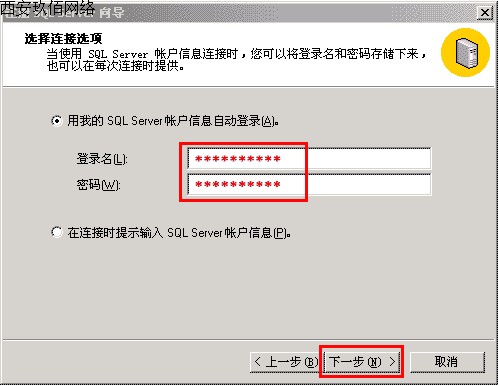 7、按下圖所示,按您的訂單中顯示的SQL用戶名和密碼,分別填寫后,點下一步;