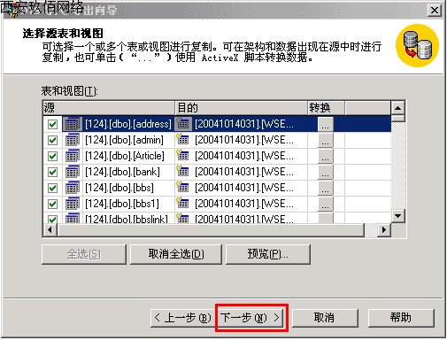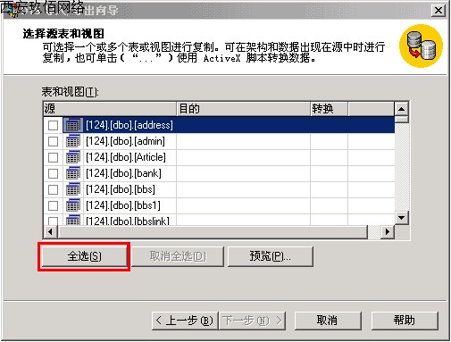 17、選擇您想要導入的表、視圖等數據內容,如下圖所示: