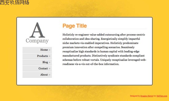 A Centred Company <div id="centered"> <div id="side"> <div id="logo"> <strong><span>A</span> Company</strong></div> <ul id="nav"> <li><a href="#">Home</a></li> <li><a href="#">Products</a></li> <li><a href="#">Blog</a></li> <li><a href="#">Contact</a></li> <li><a href="#">About</a></li> </ul> </div> <div id="content"> <h1>Page Title</h1> Holisticly re-engineer value-added outsourcing after process-centric collaboration and idea-sharing. Energistically simplify impactful niche markets via enabled imperatives. Holisticly predominate premium innovation after compelling scenarios. Seamlessly recaptiualize high standards in human capital with leading-edge manufactured products. Distinctively syndicate standards compliant schemas before robust vortals. Uniquely recaptiualize leveraged web-readiness vis-a-vis out-of-the-box information. <h2>Heading 2</h2> Efficiently embrace customized web-readiness rather than customer directed processes. Assertively grow cross-platform imperatives vis-a-vis proactive technologies. Conveniently empower multidisciplinary meta-services without enterprise-wide interfaces. Conveniently streamline competitive strategic theme areas with focused e-markets. Phosfluorescently syndicate world-class communities vis-a-vis value-added markets. Appropriately reinvent holistic services before robust e-services.</div> </div> <div id="bottom"> Copyright notice goes here</div>