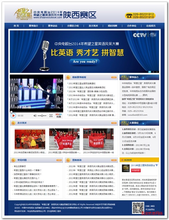 中央電視臺“希望之星”英語風采大賽 http://www.shaanxioutlook.com (以下簡稱“大賽”)是唯一一項由中宣部、國家廣電總局正式批準的、中央電視臺主辦的面向全國的大型電視英語比賽。大賽以培養興趣、增強信心、展示風采、樹立榜樣為目的,參賽選手來自全國各省、市、自治區,涉及各行各業,以在校學生為主。大賽一直以其無可比擬的學術地位與媒體影響力著稱,被視為國內同類比賽中檔次和規模最高的賽事。現已成為中國規模最大、最有影響力的外語比賽,為各年齡段的英語愛好者提供了一個實現英語夢想、展望美好未來的舞臺。